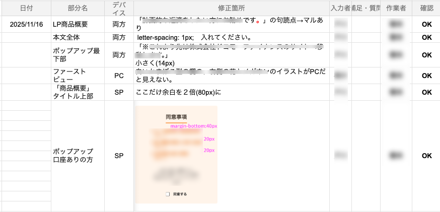 このシートだけでやりとりしようとしてはいけません。「話したほうが早いわ!」っていう修正点は、このシートをもとにリモート会議で、画面共有などしながら口頭で伝えるに限ります。