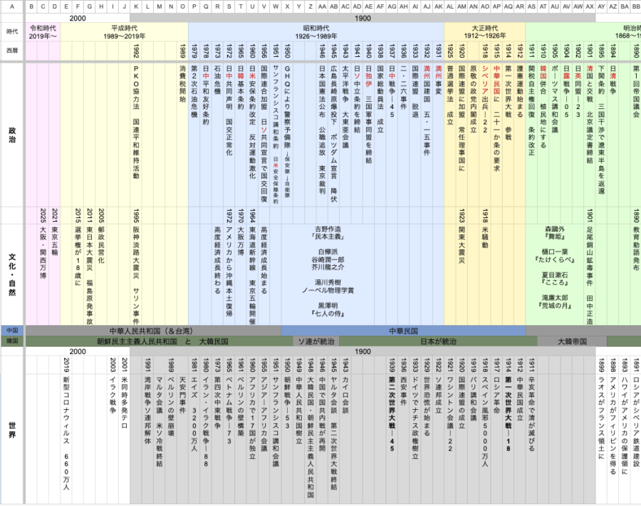 あと、「どのぐらいの期間か」がわかるよう、用紙サイズ気にせず同じ列幅でスプレッドシートに年表を写してみました。